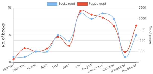 A média de páginas dos livros que li foi de 262 páginas e levou, em média, 11 dias para terminar cada livro!