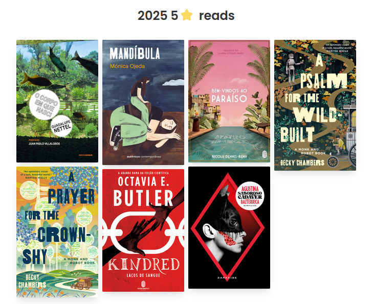 Impossível escolher um só. As minhas leituras 5 estrelas foram duas releituras (O corpo em que nasci e Mandíbula) e descobri autoras perfeitas que entraram nessa lista: Becky Chmabers e sua duologia, Saboroso Cadáver da Agustina Bazterrica, Kindred da Octavia Butler, Bem-vindos ao paraíso da Nicole Dennis-Benin.