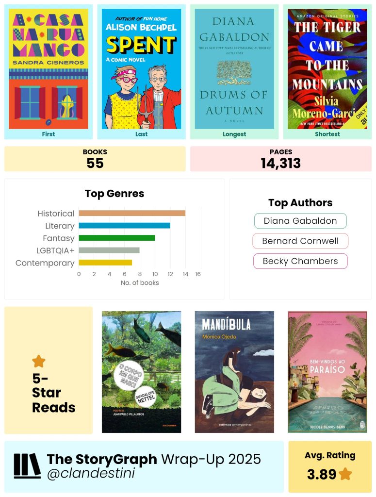Consegui bater a meta de 55 livros lidos em 2025. Não foi fácil e reservar momentos diários de leitura como um ritual de colocar live de leitura de algum booktuber e fica lendo por uma hora acompanhada, foi fundamental para conseguir. Aliás, estou precisando retomar esse hábito esse ano, porque tá difícil.