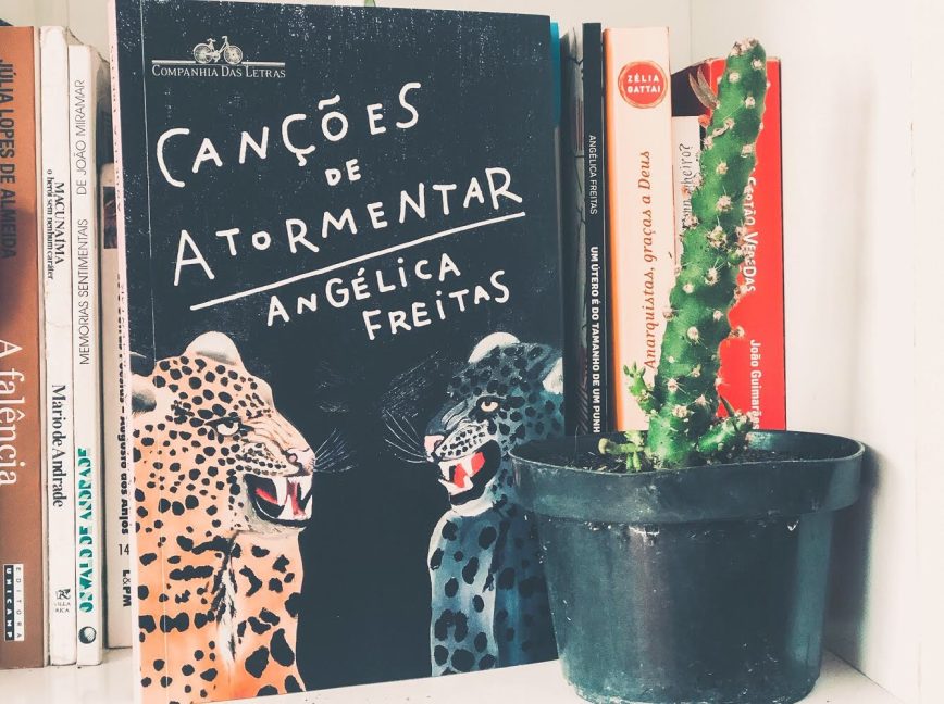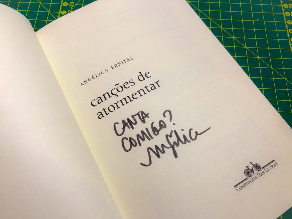 Saí de casa, um momento de exceção. Caminhei 500 metros do prédio onde moro até a Livraria Baleia, livraria essa que não conhecia, apesar de ficar exatamente em frente ao local em que treinava roller derby (quantos séculos se passaram desde o último treino?). Máscara, álcool gel depois de tocar a campainha. Peguei a sacolinha com a minha encomenda, o livro que comprei na pré venda. Canções de atormentar. Depois de ler O útero é do tamanho de um punho e ser arrebatada pela poesia de Angélica Freitas eu precisava comprar esse livro. E foi assim, na pré venda, mesmo sem dinheiro porque vinha autografado. E veio. A mensagem? “Canta comigo”.